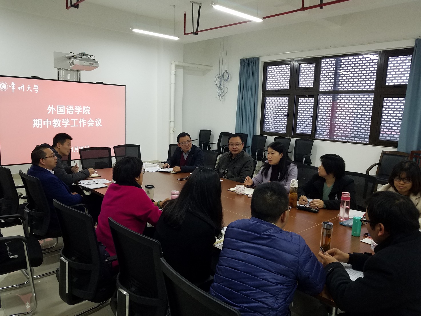 11月25日下午,外国语学院在西太湖校区立言楼431会议室召开期中教学工作会议。学院全体领导、各系部主任及专业负责人参加会议,副院长陈林俊主持会议。