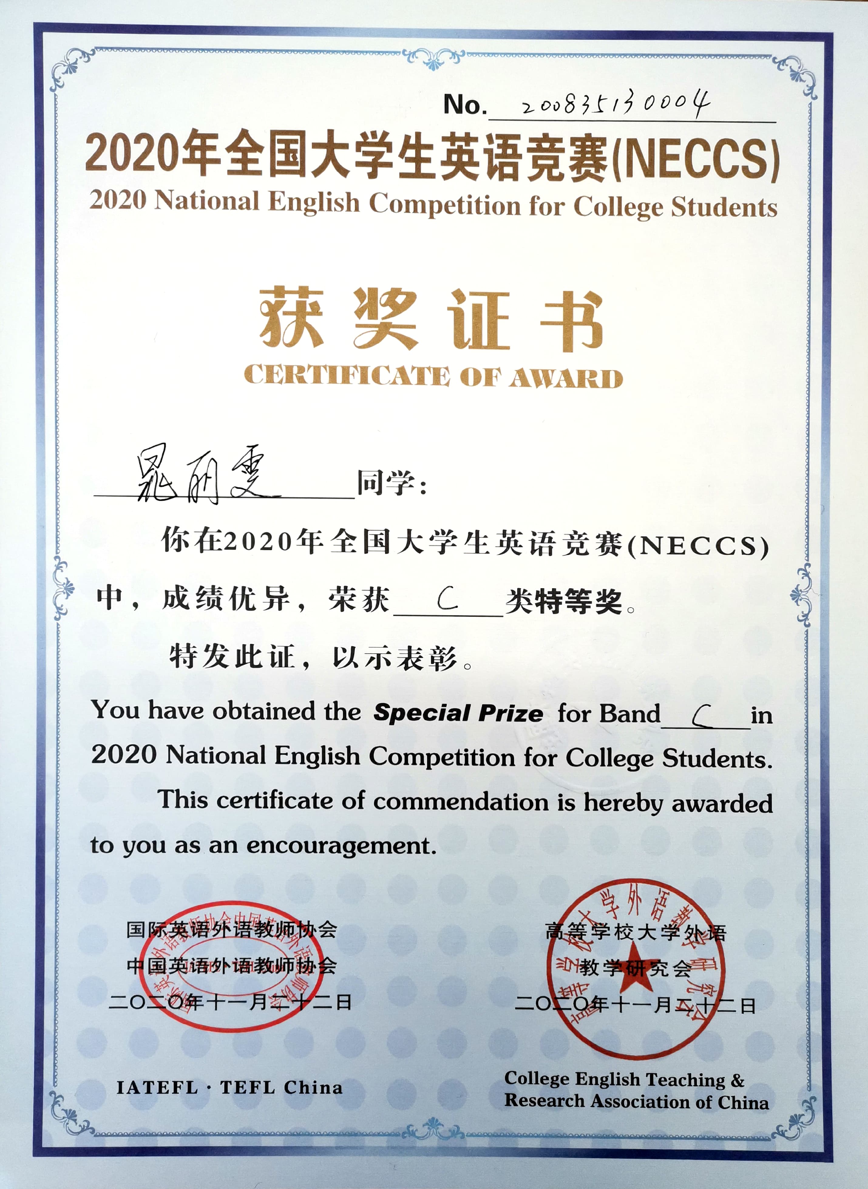 日前,2020年全国大学生英语竞赛落下帷幕。我校学子在本届比赛中表现出色,来自中爱194(电子)班的晁丽雯同学获得特等奖,另有28名同学获得一等奖,144名同学获得二等奖,241名同学获得三等奖,获奖人次为历年最高。