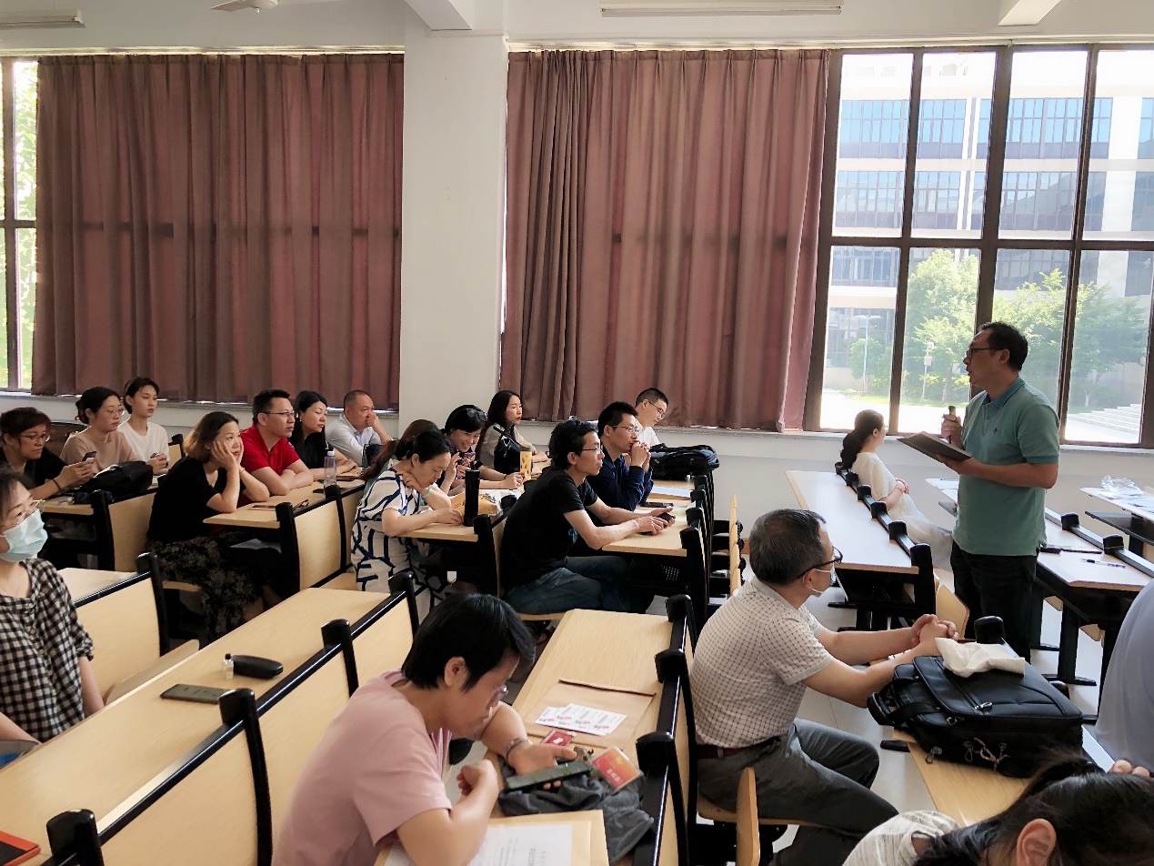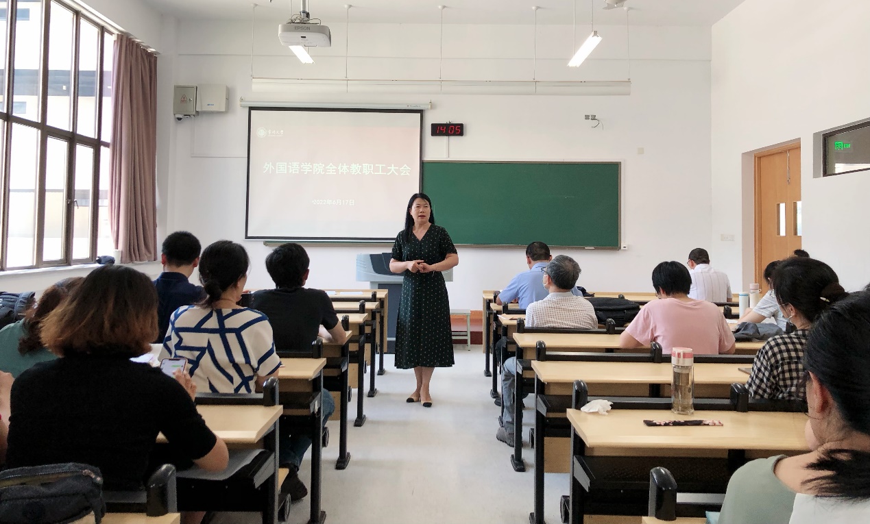 2022年6月7日14:00,外国语学院全体教职工大会在西太湖校区立德楼X123教室召开。各分管领导就期末重点工作进行部署,并就下一步工作做出安排。会议由院长陈颖主持,学院全体教职工参加会议。