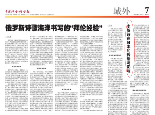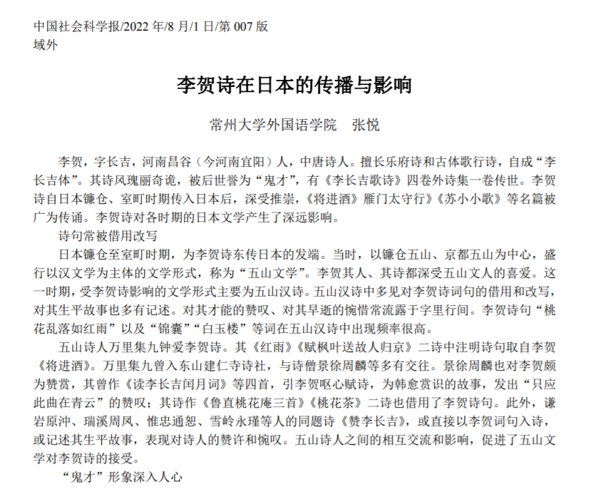 8月1日出版的《中国社会科学报》第007版(“域外”)刊发我院日语系张悦博士的论文《李贺诗在日本的传播与影响》。张悦博士曾于2021年1月4日在该版发表《汉籍在日本的传播及影响》一文。两篇论文是她近年来致力于中国传统文化在日本传播与影响研究的代表性成果。