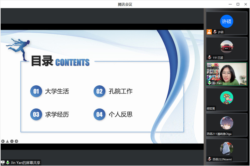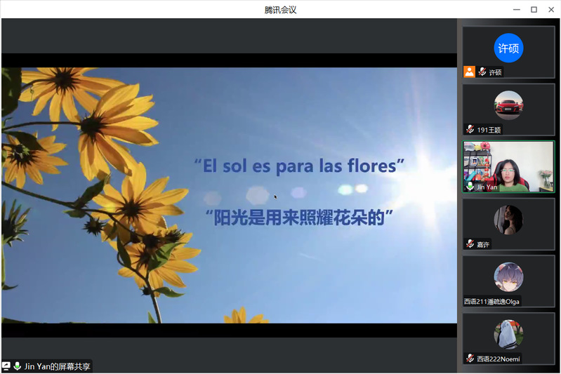 近日,外国语学院邀请到了2014级西班牙语专业校友严瑾进行孔院工作、读研和读博经验分享会,西班牙语系部分师生参与了分享会。严瑾同学毕业后赴哥斯达黎加孔子学院担任汉语教育志愿者教授汉语,后赴西班牙留学,2019年硕士毕业于西班牙格拉纳达大学,现于西班牙巴塞罗那自治大学攻读西班牙语语言学博士。
