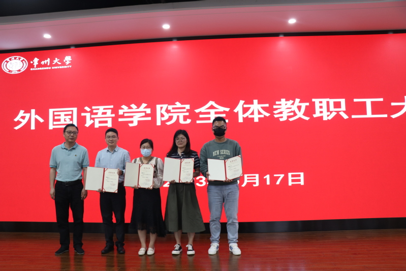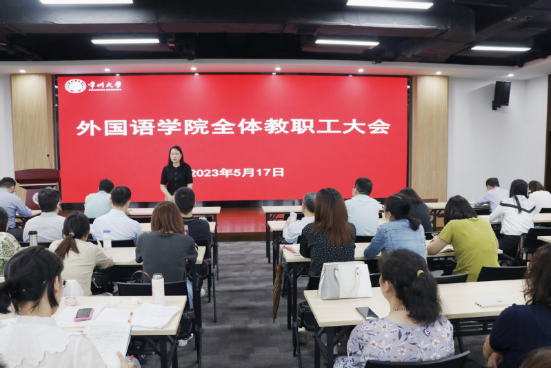 5月17日下午,外国语学院在西太湖校区立言楼多功能会议室召开全体教职工大会,全体教职工参加会议,会议由学院党委副书记丁宪成主持。