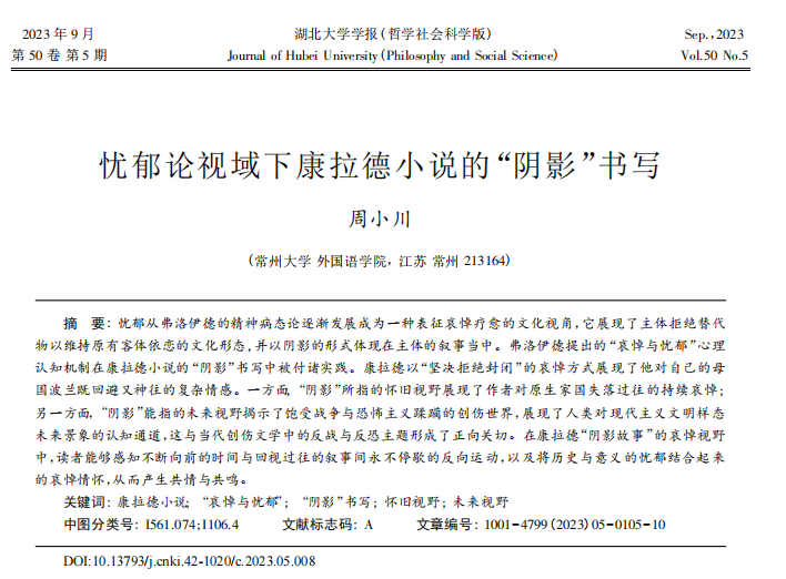 英语系周小川博士在CSSCI来源期刊《湖北大学学报》(哲学社会科学版)2023年第5期上发表论文《忧郁论视域下康拉德小说的“阴影”书写》。该文为他主持的江苏省高校哲学社会科学研究一般项目“康拉德小说民族精神共同体的精神内涵研究”( 2021SJA1253) 的阶段成果之一。