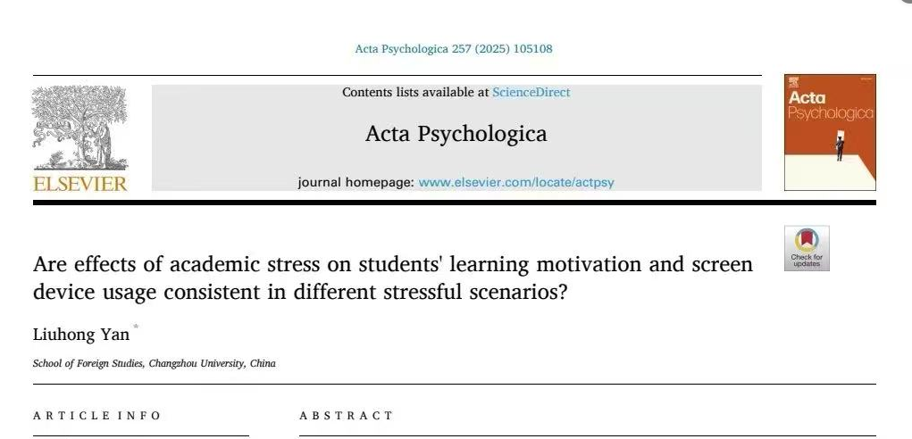近期,我院大学外语教学部颜榴红老师的学术论文Are effects of academic stress on students’ learning motivation and screen device usage consistent in different stressful scenarios?发表于SSCI期刊Acta Psychologica第257期。这是我院教师迈向学术国际化进程的又一重要体现。