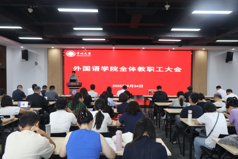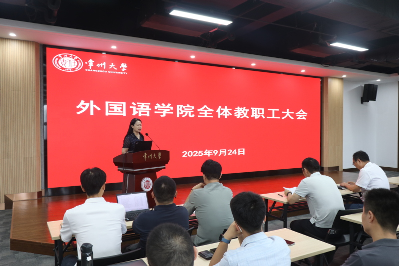 9月24日下午,外国语学院在西太湖校区立言楼458会议室召开九月全体教职工大会。外国语学院全体教职工参会,会议由学院党委副书记蔡震宇主持。