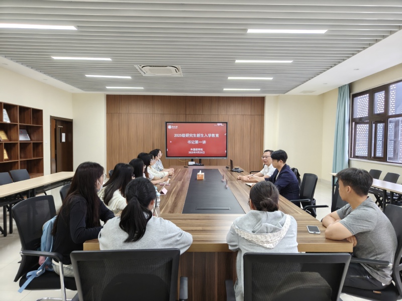 2025年9月30日上午,学院在立言楼431会议室召开2025级研究生入学教育会议,由学院党委书记薛勇开展“书记第一讲”思想政治教育活动,学院党委副书记蔡震宇参加会议,全体2025级MTI研究生到会学习。
