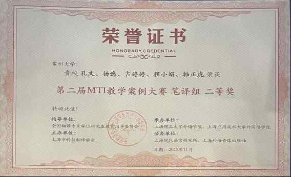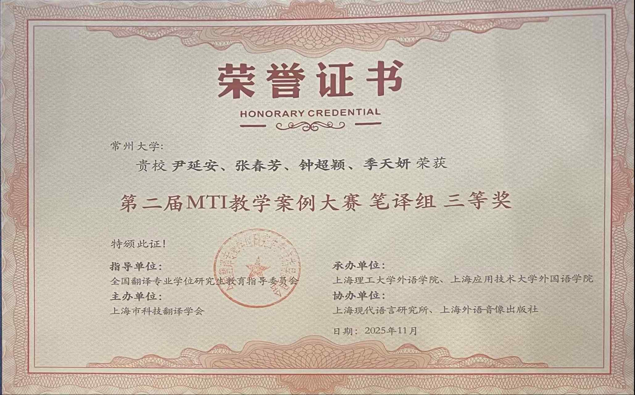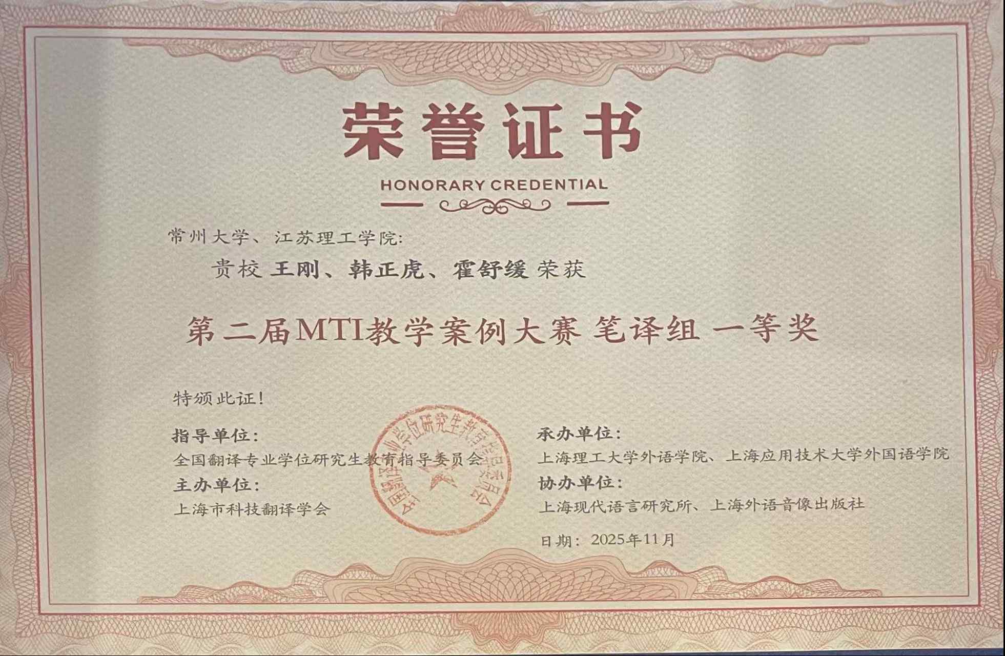 2025年11月1日,2025年MTI案例教学研讨会暨第二届MTI教学案例大赛颁奖典礼在上海应用技术大学奉贤校区顺利举行。外国语学院王刚、韩正虎师生团队所提交的《人工智能译后编辑策略研究——以能源政策文本为例》荣获笔译组一等奖;孔文、杨逸、吉婷婷、程小娟师生团队提交的《AI译痕识别与优化:以能源翻译教学为例》荣获笔译组二等奖;尹延安、张春芳、钟超颖、季天妍师生团队提交的《OPEC能源组织文件汉译教学案例》荣获笔译组三等奖。王刚博士受邀代表学院在研讨会上就案例教学的实施经验与方法进行了分享。