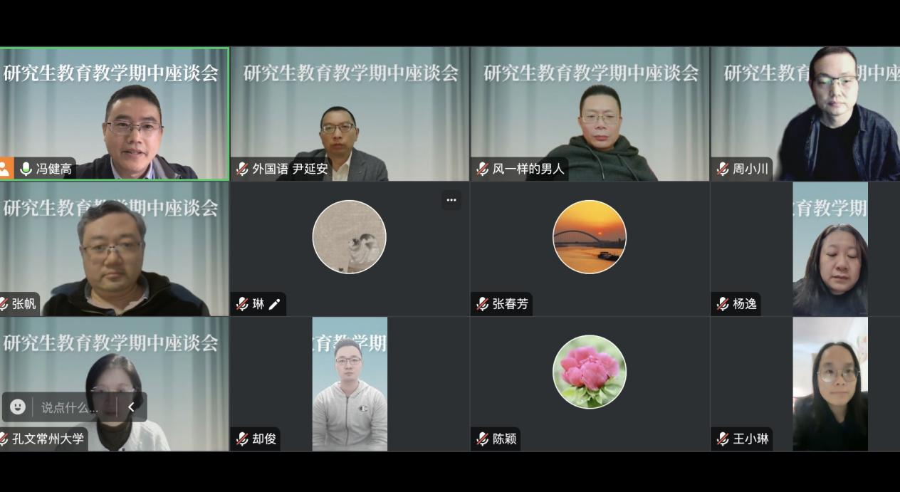 为全面了解开学以来研究生教育教学的整体状况,精准把握教育教学过程中的重点与难点,进一步提高翻译硕士(MTI)教育教学质量,11月6日晚,外国语学院MTI教育中心以线上方式召开研究生期中教育教学座谈会。外国语学院院长陈颖、副院长兼MTI教育中心主任尹延安、研究生院督导王琳,MTI教育中心全体导师及工作人员出席会议。会议由院长助理、MTI教育中心执行主任冯健高主持。