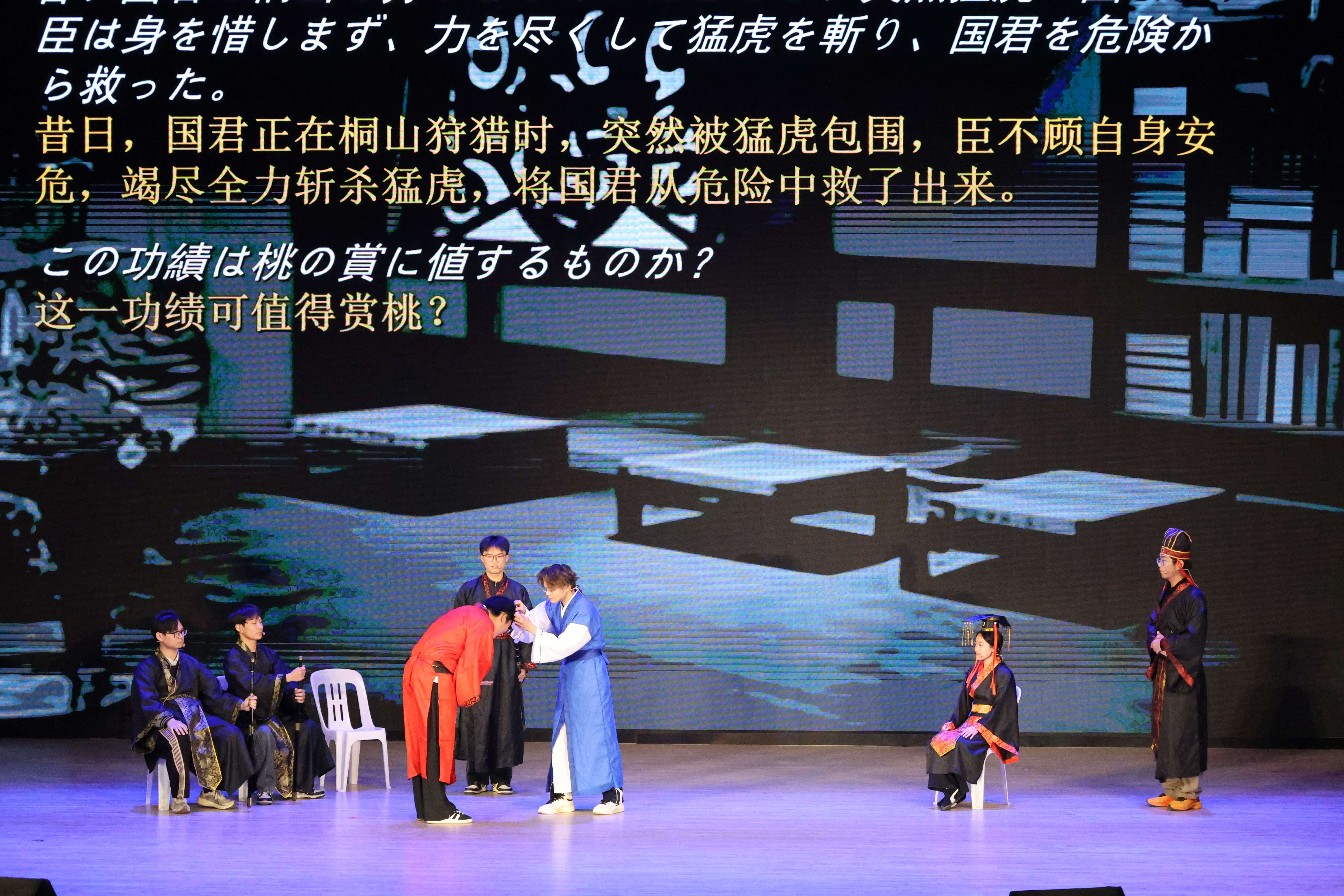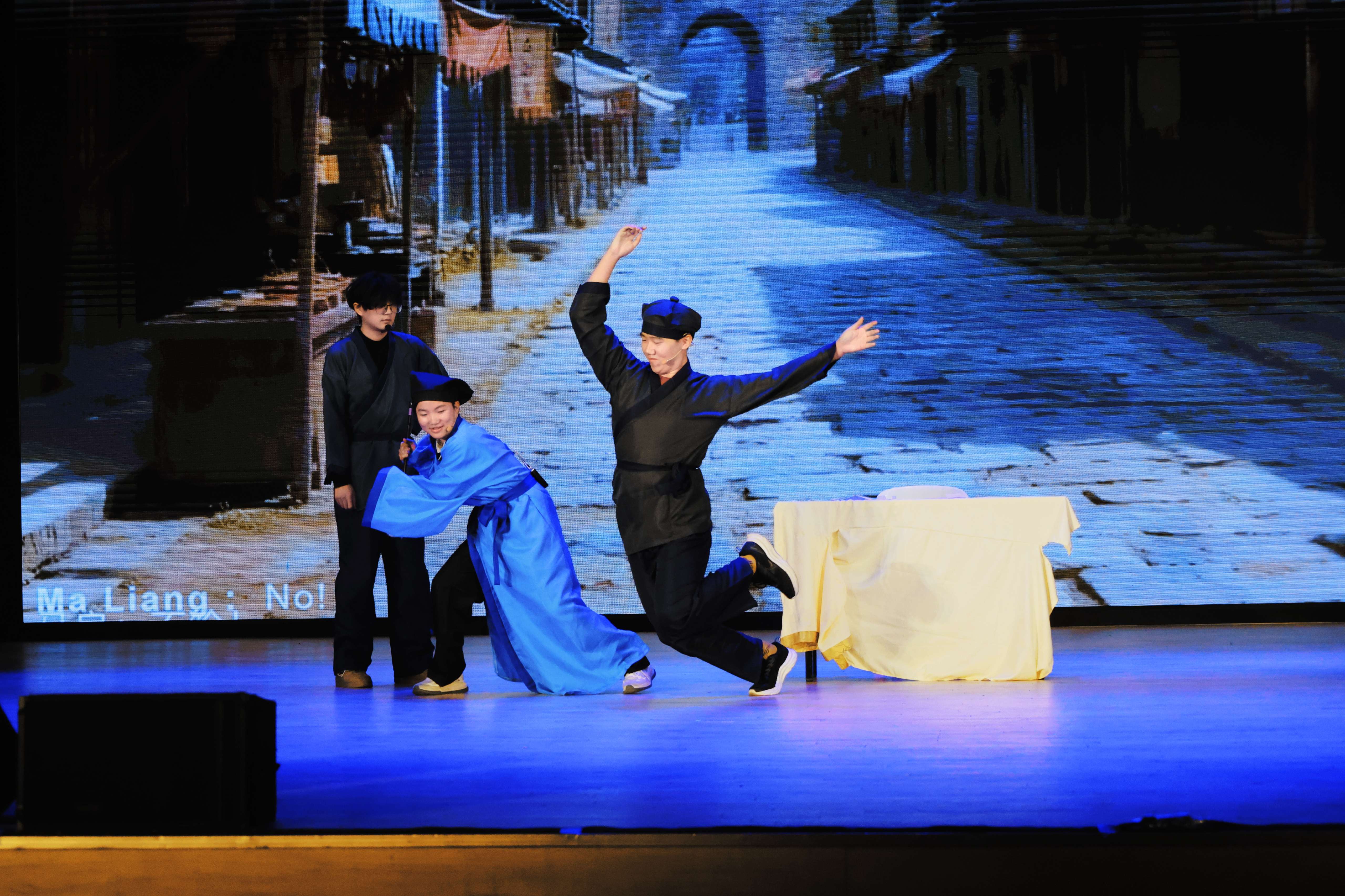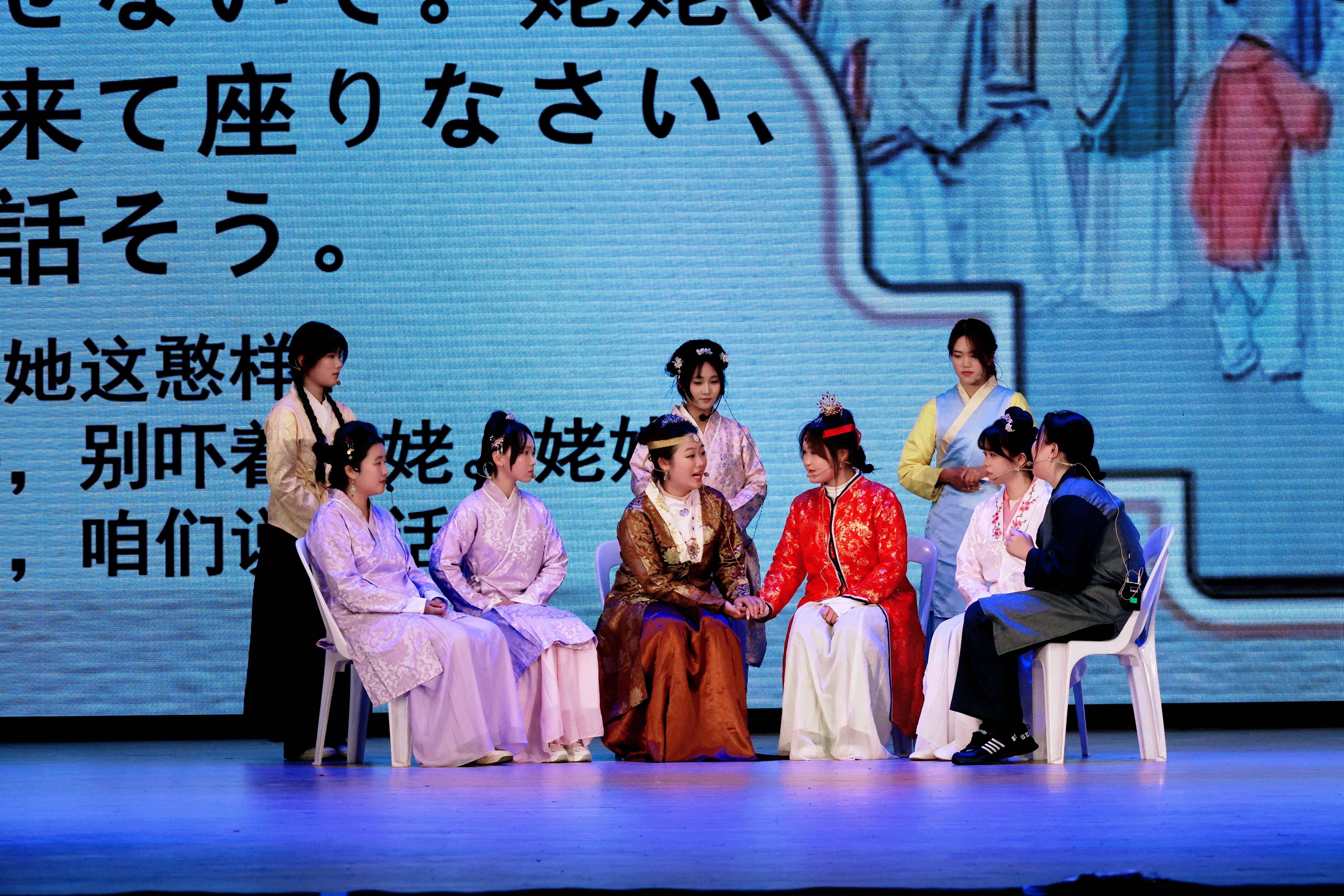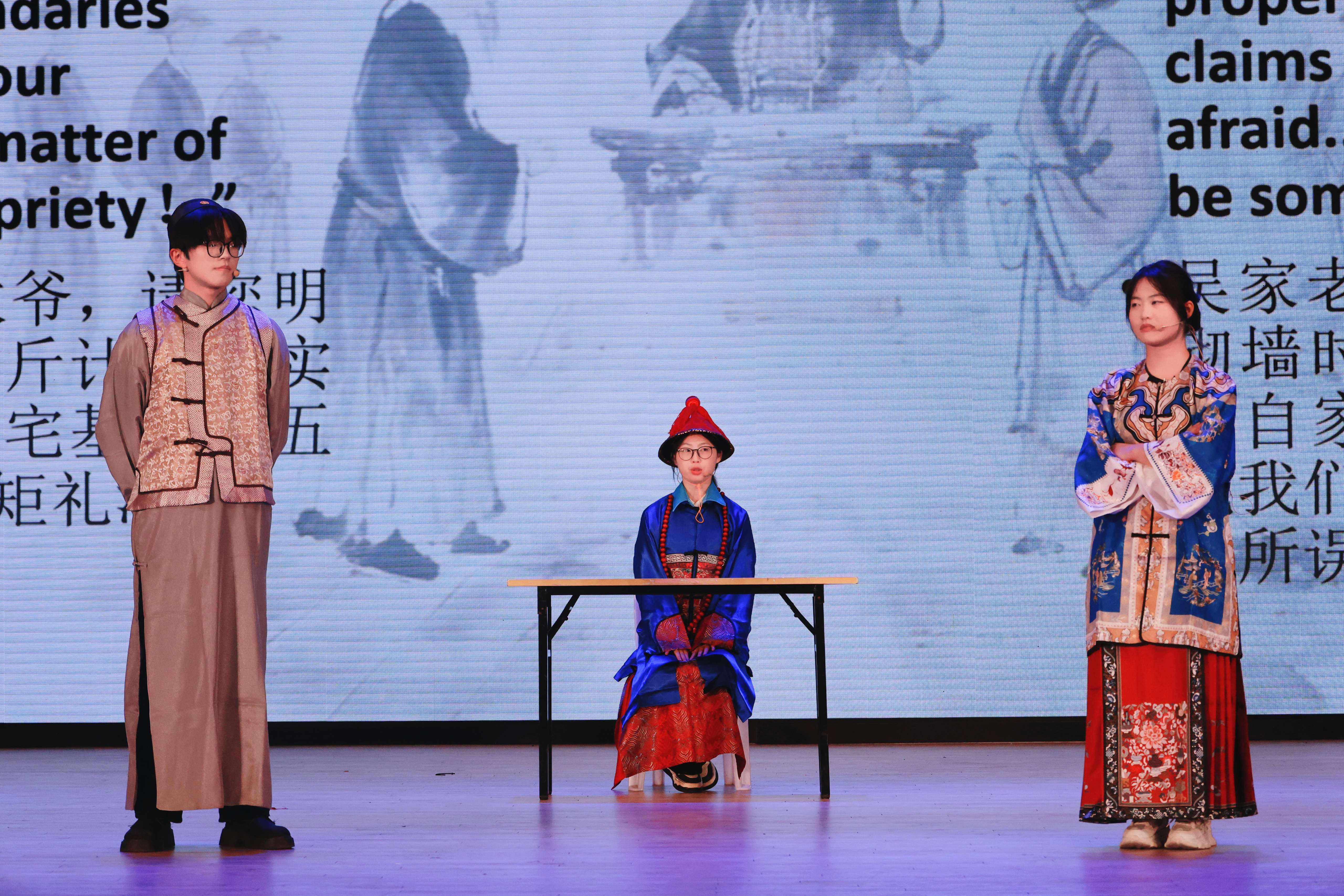 经过激烈角逐,《春逝》等两项作品获一等奖,《刘姥姥进大观园》等三项作品获二等奖,《二桃杀三士》等五项作品获三等奖。舞台上,演员们的台词打磨与默契配合,背后是跨学院团队的反复排演。《六尺巷》作品主演英语242胡华玲表示:“用外语讲中国故事,既要把传统故事的内核讲准,又得用外语的逻辑和表达让它“落地”,过程里有“把自己熟悉的文化重新‘翻译’给世界”的成就感”。