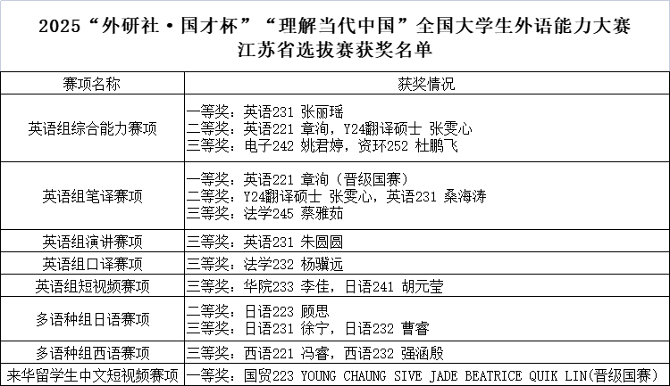 近日,2025“外研社·国才杯”“理解当代中国”全国大学生外语能力大赛江苏省选拔赛顺利落下帷幕。经过激烈角逐,我校学子共获得一等奖3项,二等奖5项,三等奖11项,首次在所有参加的赛项中都获得了奖项。其中英语221班章洵同学和国贸223班毛里求斯留学生YOUNGCHAUNGSIVEJADEBEATRICEQUIKLIN分别在英语组笔译赛项和来华留学生中文短视频赛项中荣获一等奖并晋级国赛。