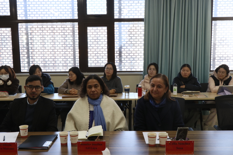 陈颖首先对远道而来的嘉宾表示热烈欢迎,并简要介绍了学院在人才培养、专业建设、国际交流等方面取得的成果,希望以此次交流为契机,进一步拓展双方在语言教学和学术研究等领域的交流合作。詹妮弗·吉尔和西莉亚·桑切斯分别介绍了各自学校及孔子学院的办学情况,向我院对孔院工作的支持表示感谢,并期待未来有更多的师生交流与学术研究等合作。在自由交流环节,西班牙语系师生与外宾围绕教学、语言学习等话题展开轻松而热烈的对话。学生们踊跃提问,外方嘉宾也分享了拉美地区的教育与文化特色,现场互动频繁。