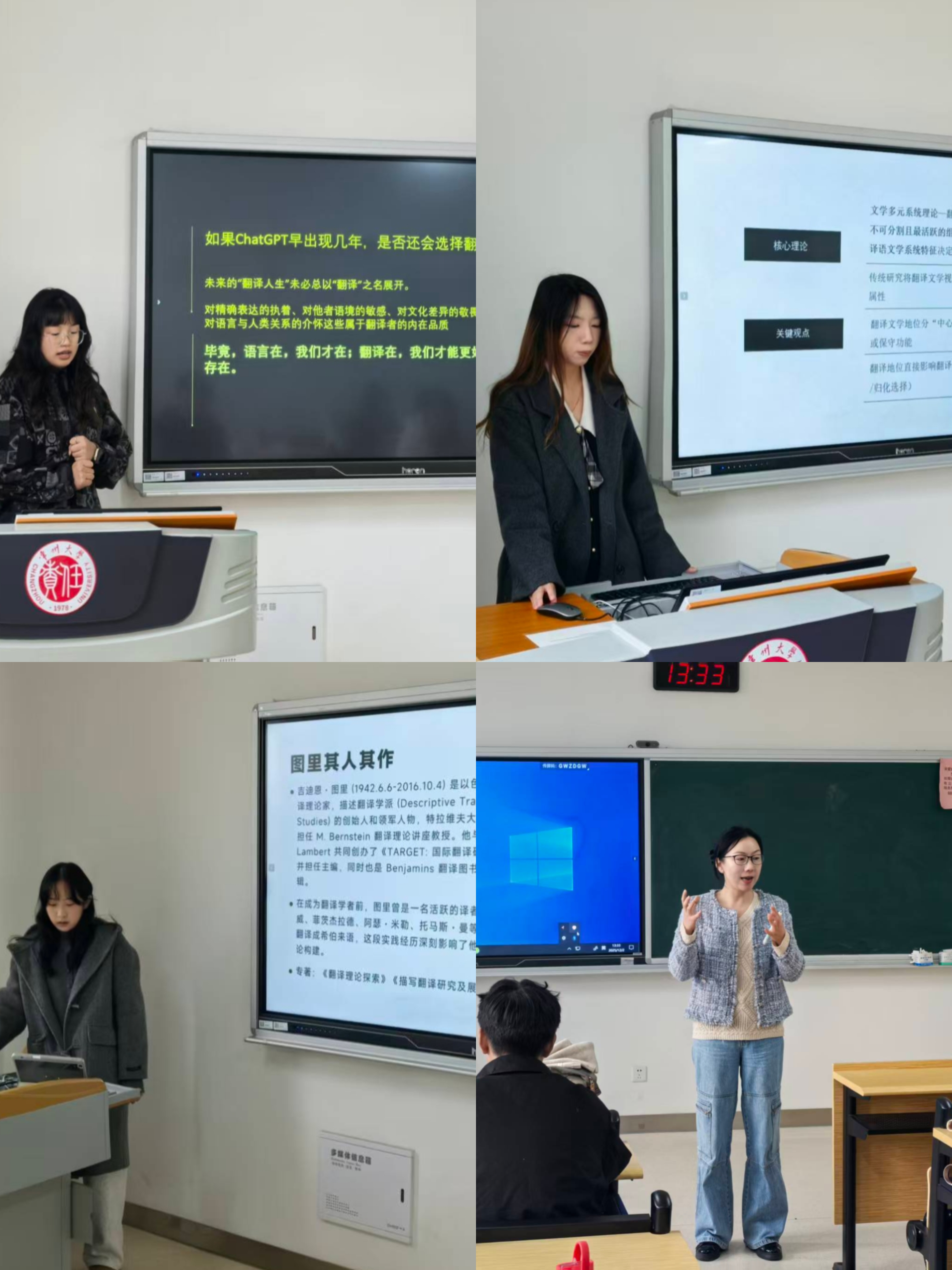 在主题汇报环节,同学们围绕《翻译学的名与实》、《描述性翻译研究及其他》、《翻译文学在文学多元系统中的地位》等文献展开汇报。有同学在汇报译者惯习的基础上提出“AI伪惯习”的新颖观点收获了老师与同学们的肯定。整个汇报现场同学们发言踊跃,讨论深入,气氛活跃,体现了研究生们对于该主题的思辨。