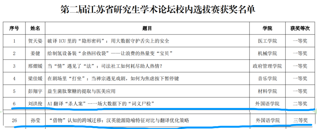 在近日结束的第二届江苏省研究生学术论坛校内选拔赛中,我院2025级英语笔译专业研究生刘洪俊、孙莹分别取得二等奖和三等奖的好成绩,这也是我院首次参赛即获得佳绩。本次比赛共有来自18个学院的77名选手参赛,共评出一等奖5项、二等奖10项、三等奖20项。