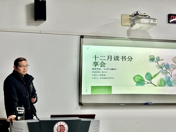 12月26日上午,2025-2026学年第四期MTI研究生读书会在立德楼104教室顺利举行。硕士生导师周小川副教授担任领读人,与全体研究生共同研读许渊冲先生所著的《文学与翻译》,深入探究其文学翻译理论体系与当代价值。