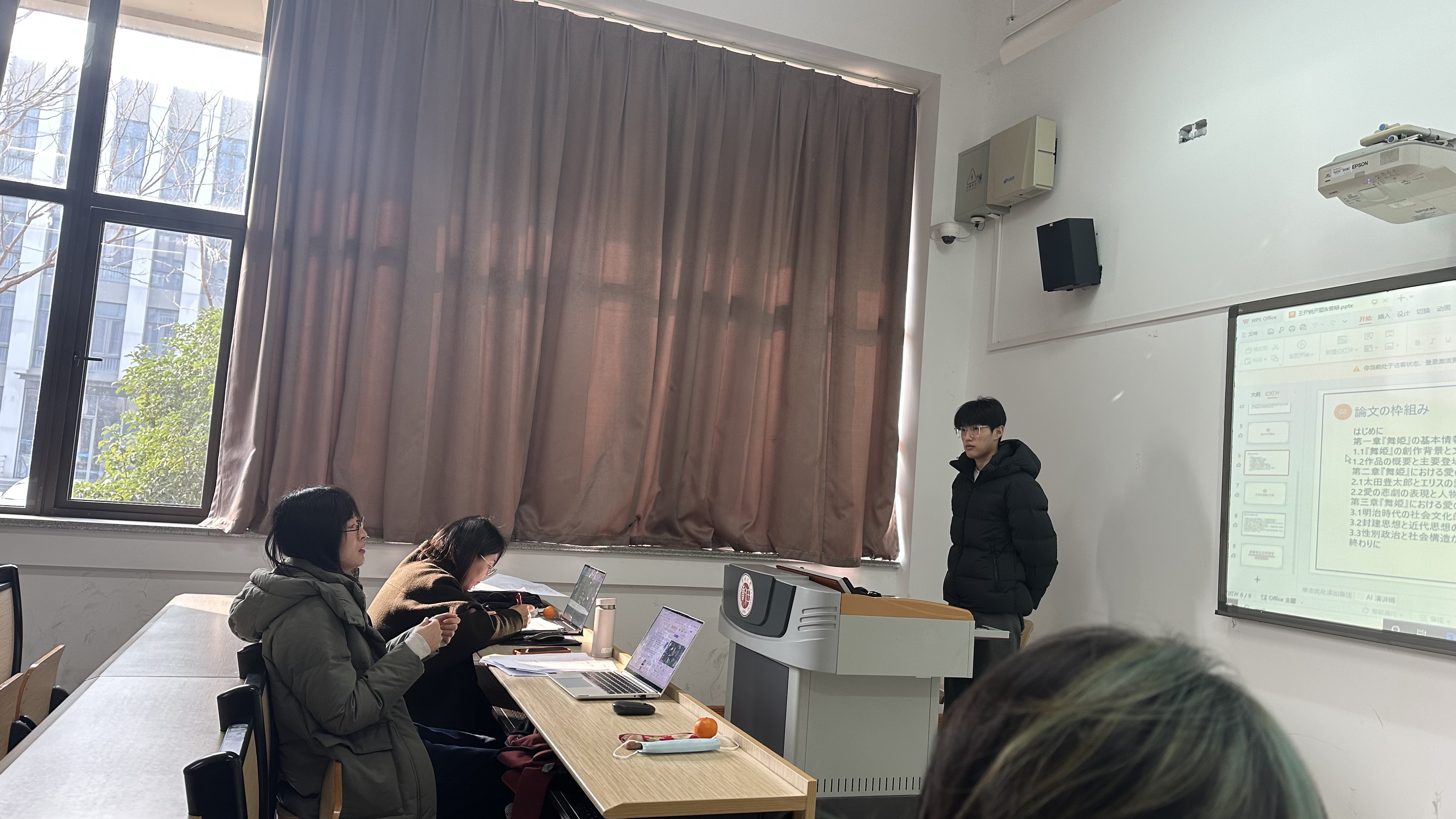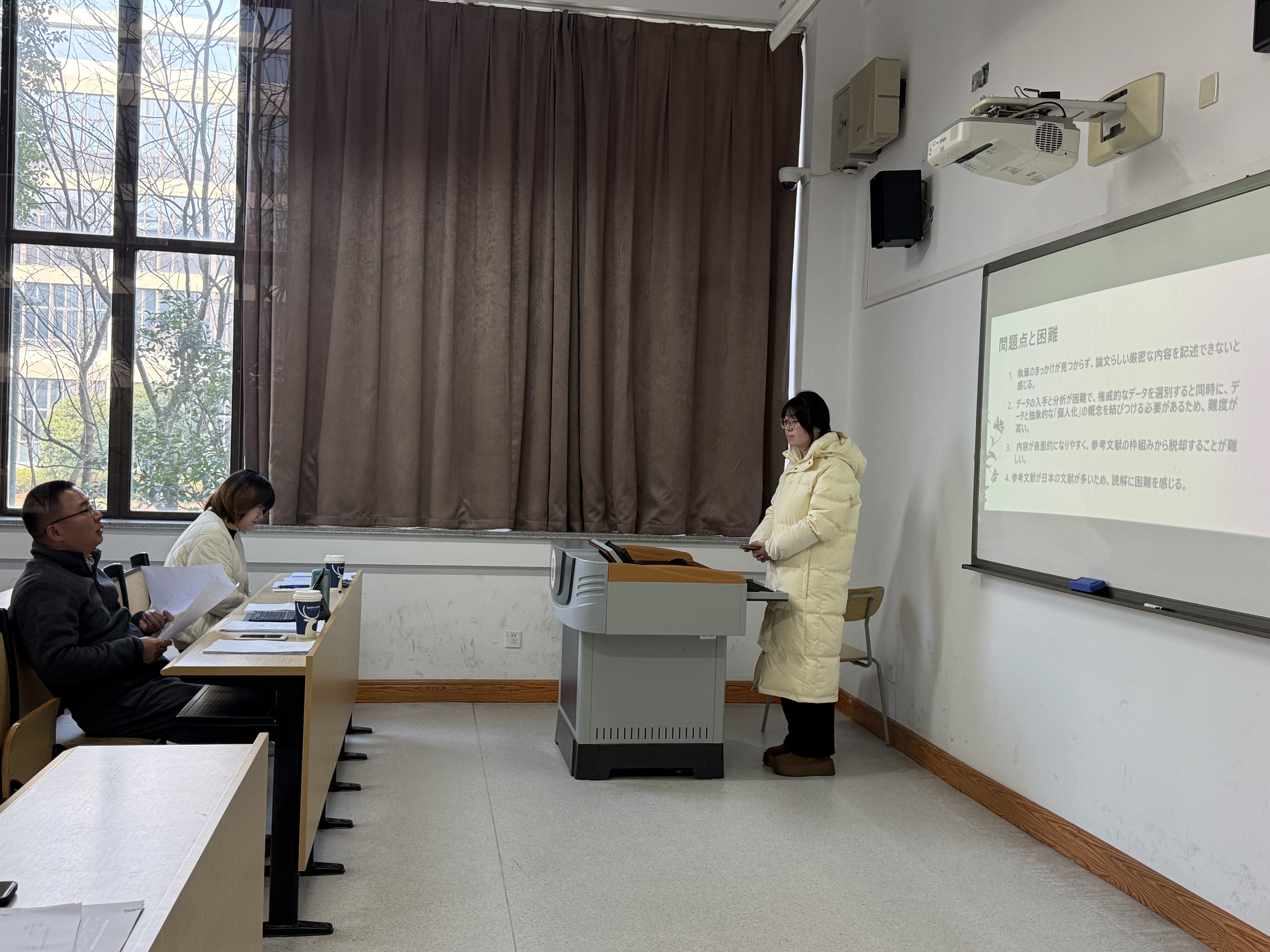 答辩过程中,学生使用日语PPT围绕论文选题、研究框架及当前困难进行陈述,并接受评委的提问与指导。各组教师认真评议,针对性提出修改建议,帮助学生明确后续写作方向。整体答辩流程规范、节奏紧凑,学生表现认真,展现出良好的学术基础与表达能力。