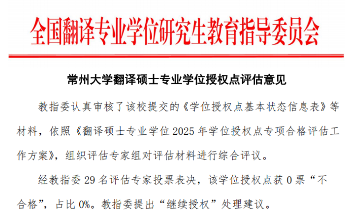 近日,全国翻译专业学位研究生教育指导委员会正式公布了2025年翻译专业学位(MTI)授权点专项合格评估的结果。经教指委核验专家组投票表决,我院MTI学位授权点以全票结果通过本次专项合格评估,并获得“继续授权”的处理建议。