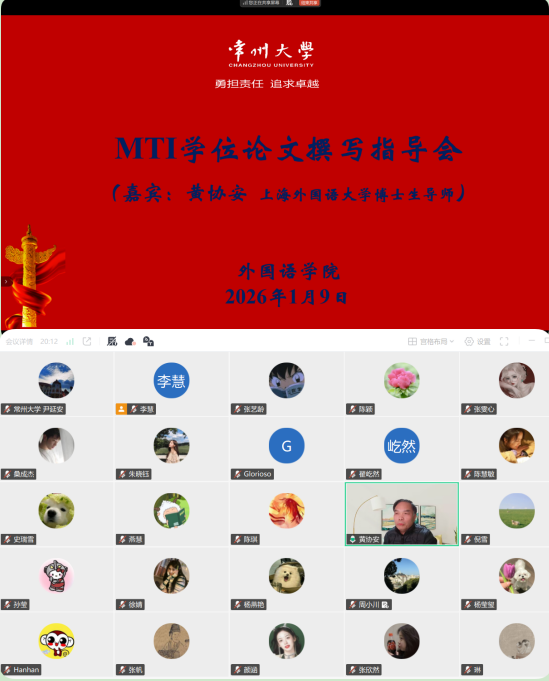 1月9日晚,为进一步提升研究生培养质量,提高导师对学位论文的指导能力,帮助研究生明确学位论文写作要点,学院MTI教育中心组织召开学位论文指导与写作研讨会,并特邀上海外国语大学高级翻译学院博士生导师黄协安教授到会做专题讲座。研讨会由学院副院长兼MTI教育中心主任尹延安主持,全体硕士生导师和研究生参会。