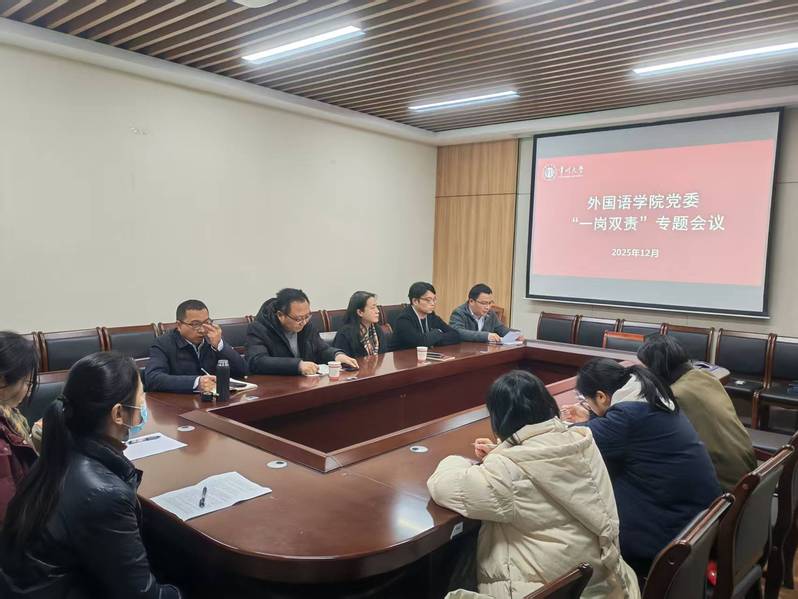 12月25日,外国语学院党委在科教城校区文彰楼513会议室召开“一岗双责”专题会议,会议由学院党委书记薛勇主持,党委委员、党支部书记参加会议。