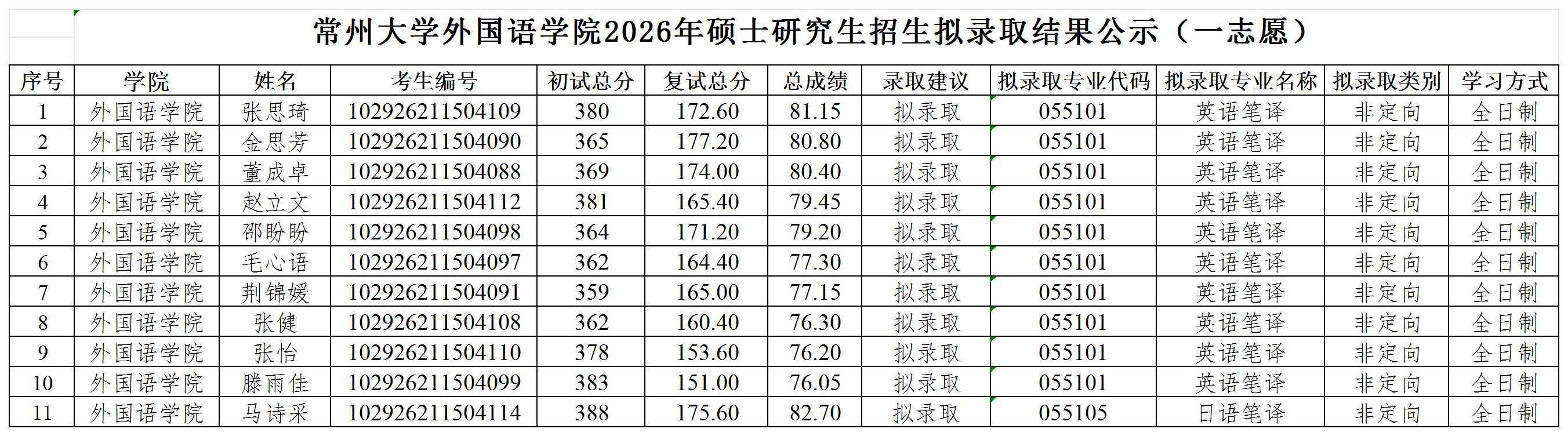 常州大学外国语学院2026年硕士研究生招生拟录取结果公示(一志愿)