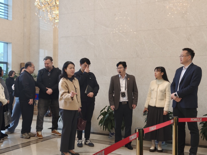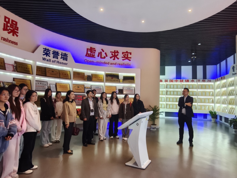 参观结束后,全体师生与汤姆森集团领导层举行座谈交流会。集团总裁汤建华详细介绍集团组织架构、发展理念及国际化业务布局,重点分享了企业对外语类人才的迫切需求。外国语学院院长陈颖向企业方介绍了学院办学特色、专业设置及人才培养成果。双方围绕当前国际贸易背景下外语人才的能力要求、职业发展路径等话题展开深入交流,并就未来深化校企合作、共建实习实践基地等议题达成初步共识。座谈交流后,师生们实地参观了汤姆森集团生产车间及各职能办公区域,近距离感受企业真实的工作场景和运营状态。