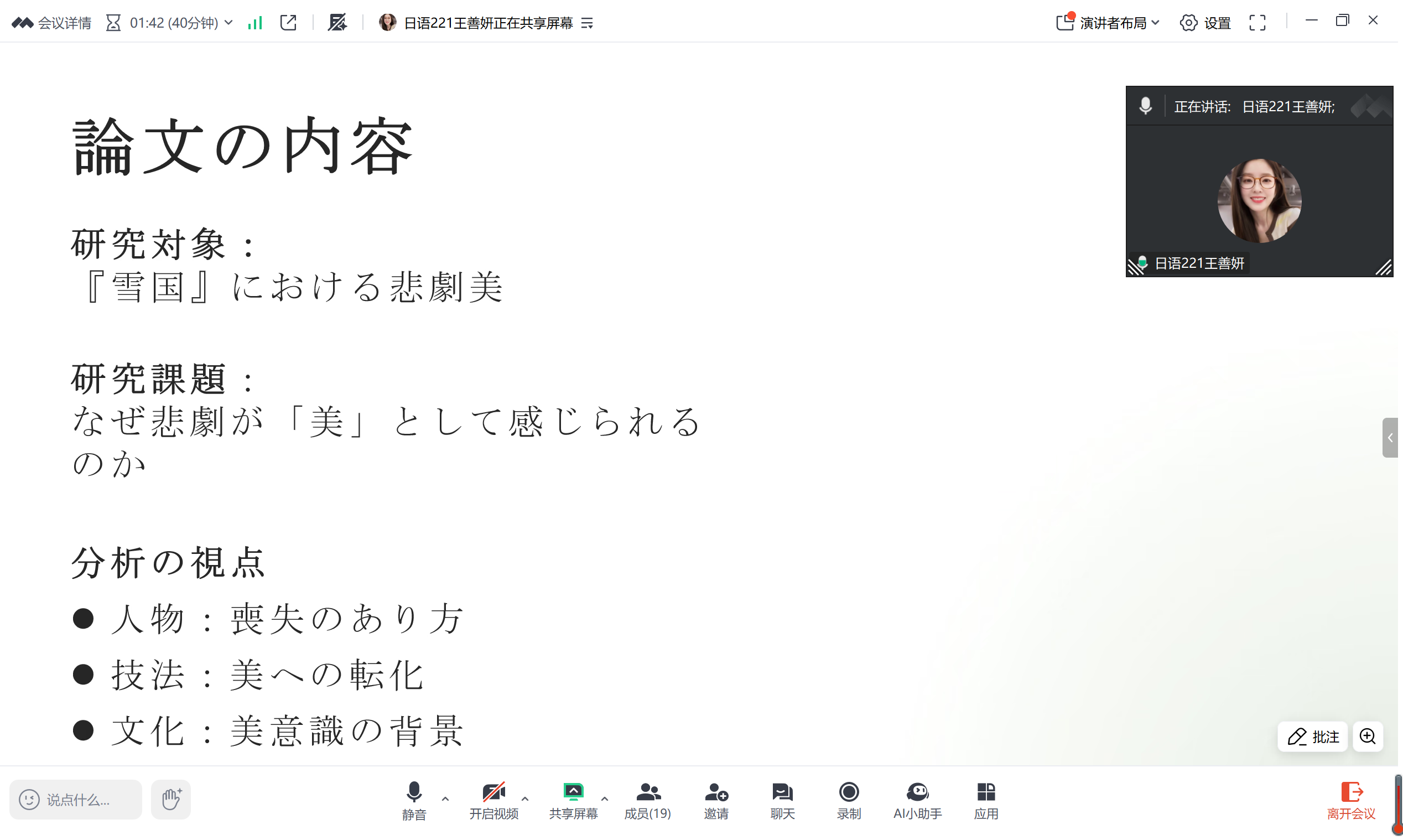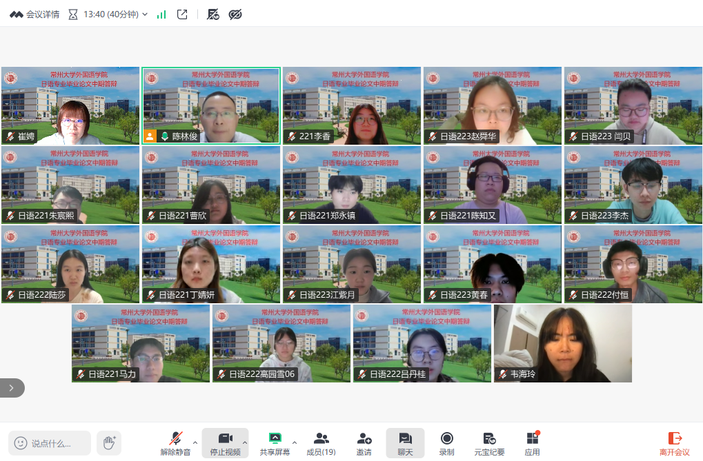4月17日晚,外国语学院日语专业2026届本科毕业论文中期答辩会以线上形式成功举行。本次答辩会分为五个小组,分别由陈林俊、刘萍、王永萍、张悦、吴丽霞五位老师担任答辩组长。