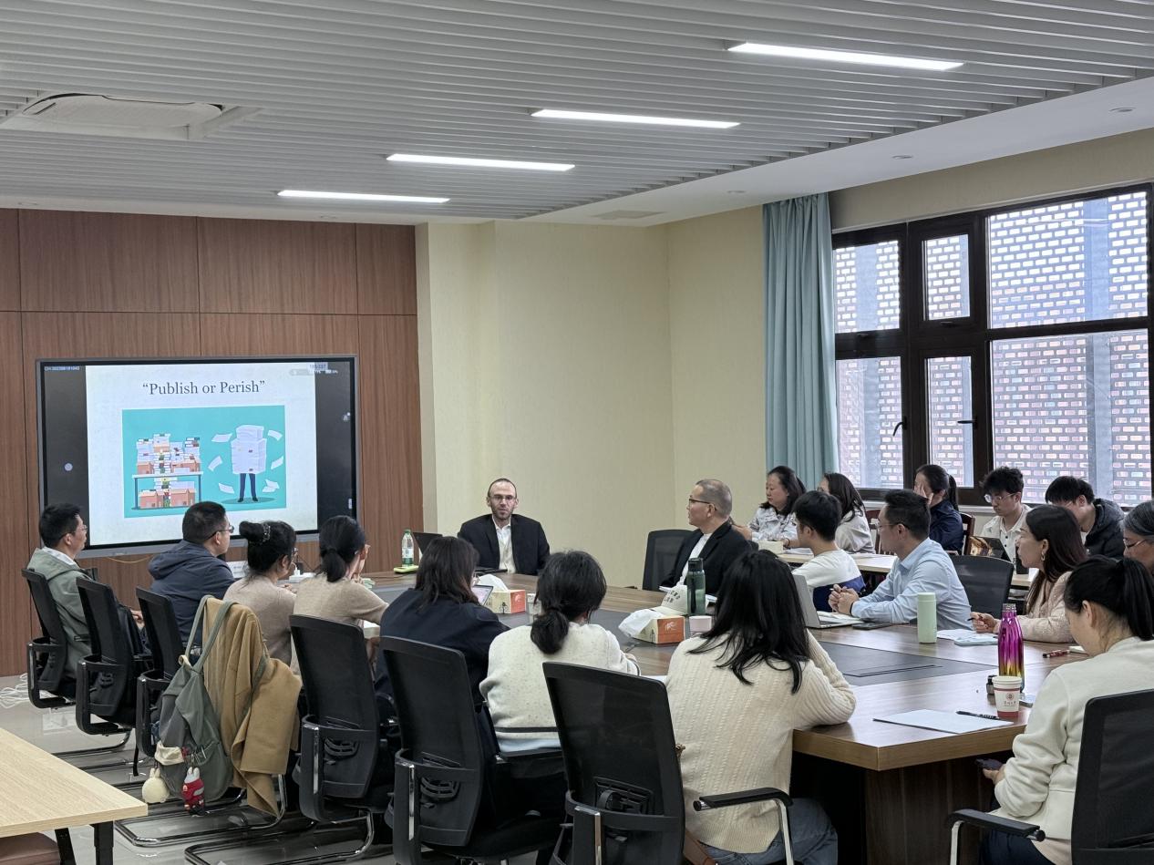 讲座伊始,Neidorf教授首先厘清了人文科学与社会科学在学术研究中的本质差异。他指出,人文科学研究多以小说、诗歌等静态文本为对象,重在深度研读;而社会科学则更贴近实践,需面向动态研究对象设计方案。这种根本性差异对学术论文的撰写与发表方向具有重要指导意义。在阐述“为何要在高级别期刊发表论文”这一核心问题时,Neidorf教授打破了“发表即负担”的固有认知。他指出论文发表是高校教师知识生产的核心标志,既能锤炼思维、拓展学术人脉,也能反哺课堂教学、提升学校整体科研实力,更能实现与古今学者的对话,让学术思想得以延续。随后,Neidorf教授重点解读了高级别期刊论文发表的四项核心标准,为研究者指明了论文撰写的关键方向。其一为“可证伪性”,论文观点不能是无法被反驳的个人主观感受或过于模糊、规避批评的表述,而应具备让他人能够提出异议、寻找反驳依据的空间。其二是“再现性”,研究者需清晰梳理论证逻辑与依据,让读者能够顺着思路理解并得出相同结论。其三为“非显而易见性”,论文观点不能是不言自明的事实。其四是“学术价值与专业知识彰显”,论文需扎根于该领域已有的学术研究,在充分了解现有成果的基础上提出原创观点,且这一观点要能对其他学者的研究产生积极影响。